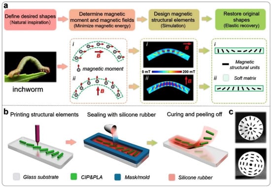 (a) Shape-programming strategy for imitation of an inchworm. The deformations are simulated by COMSOL, and the direction of the magnetic field is indicated by the red arrows. (b) Three-dimensional printing of magnetic elements and encapsulation by silicone rubber. (c) Photos of samples with oriented magnetic structural elements. The radius of the disk samples is 10 mm. Reprinted from [76], copyright (2020), with permission from Elsevier.