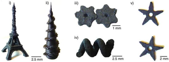 Three-dimensionally printed structures: (i) the Eiffel Tower at a scale of 1:1200 printed with NdFeB/PA12, (ii) complex helical structure combined with a conical body printed with the SrFe12O19/PA12, (iii) two 3D-printed NdFeB/PA12 gears with magnetization perpendicular to their axis, (iv) magnetic helix 3D-printed from NdFeB/PA12 and a water-soluble support material, and (v) 3D-printed ninja stars from SrFe12O19/PA12. Reprinted from [92], originally published under a CC-BY license.