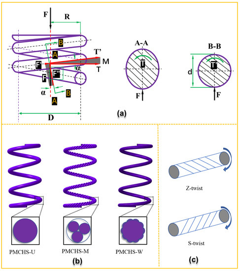 As shown in Equation (1), the spring constant can be changed by changing the shear modulus based on a fixed geometry. The shear modulus can be adjusted effectively by changing the structure of the spring reinforcement. Three kinds of PMCHSs with the reinforcement structures of unidirectional, multistrand, and wrapped (PMCHS-U, PMCHS-M, and PMCHS-W) were proposed by combining them with textile structures, as shown in Figure 1b. The reinforcement of PMCHS-U was that each fiber bundle was arranged in parallel without any entanglement and twisting between the fiber bundles. The reinforcement of PMCHS-M was to twist several bundles of fibers into a composite yarn. The reinforcement of PMCHS-W was to add the fiber bundles as the core yarn on the basis of the reinforcement of PMCHS-M. As the twist direction of the reinforcement should be designed according to the rotation direction of PMCHSs to enhance its contribution, it is necessary to determine the twist direction of the reinforcement before preparation. The shear stress at the right end face of the spring wire with any length acts clockwise in the right helical compression spring. Therefore, when the twist direction of a reinforcement structure is Z-twist, it means the direction of the shear stress is opposite to the twist direction; when the twist direction of a reinforcement structure is S-twist, it means the direction of the shear stress is the same as the twist direction, as shown in Figure 1c. However, reinforcements with multistrand or wrapped structures can maximize their torsional properties only when the twist direction is the same as the direction of the shear stress. Otherwise, the untwisting phenomenon will occur, which means the torsion performance will be significantly reduced. Therefore, the twist direction in the multistrand and wrapped structures is the S-twist direction.