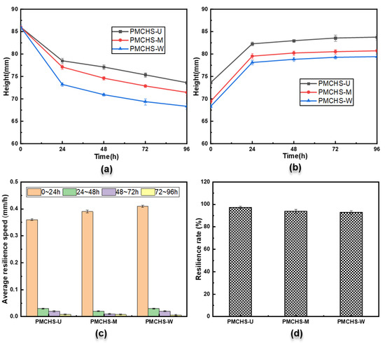 PMCHSs are constantly compressed during operation, so the resilience performance also needs to be further studied. The comparison of the resilience performance of the three PMCHSs is shown in Figure 6. It can be seen from Figure 6a that the changing trend of the heights of the three PMCHSs was the same, that is, the spring height reduced with the increase in the loading time. The heights of PMCHS-U, PMCHS-M, and PMCHS-W decreased by 8.7%, 10.4%, and 14.9% after 24 h, respectively, implying that the deformation of PMCHS-U, PMCHS-M, and PMCHS-W consequently increased. This is because the scattered internal reinforcement structural fibers in PMCHS-U made the force capacity small; hence, the damage degree of the resin was small due to less force acting on the resin. The entanglement between the reinforcement fibers of PMCHS-M and PMCHS-W improved their mechanical properties; hence, the damage degree of the resin was high due to the large force acting on the resin. The decreasing trend of the spring height showed a gradual reduction; the heights of PMCHS-U, PMCHS-M, and PMCHS-W were 73.6 mm, 71.4 mm, and 68.3 mm after 96 h, respectively. Then, the heights of the three springs continuously increased with the same trend after unloading, as shown in Figure 6b. It can be seen from Figure 6c that the average resilience speed (the ratio of the height difference in PMCHSs to the corresponding test time difference) values of PMCHS-U, PMCHS-M, and PMCHS-W in the first 24 h increased in order, which were 0.36 mm/h, 0.39 mm/h, and 0.41 mm/h, respectively. This is mainly because PMCHS-M and PMCHS-W have large energy storage due to the role of their internal reinforcement, which made them more likely to return to their original state immediately after unloading. The resilience speed of each spring gradually decreased by 0 with the increase in time. Figure 6d shows the final resilience rate of the three springs, that is, the ratio of the final height after unloading for 96 h to the initial height. The resilience rates of PMCHS-U, PMCHS-M, and PMCHS-W were consequently reduced, with 97.4%, 93.9%, and 92.8%, respectively. Compared with the results of the above compression performance, it can be concluded that the resilience performance of the PMCHSs decreased with the increase in the spring constant. This is because the toughness of the resin in PMCHSs was poor, the damage degree of the resin increased with the increase in the spring constant during the compression process, and the resilience decreased with the increase in the damage degree of the resin.