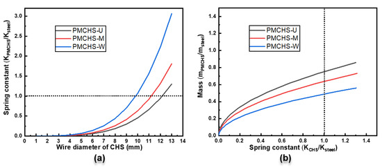 (a) The spring constant ratios of different PMCHSs to a steel spring with the increase in the wire diameter of the PMCHSs, and (b) the mass ratio of different PMCHSs to a steel spring with the increase in the spring constant ratio. The dot line means the PMCHS and steel springs having the same spring constant.