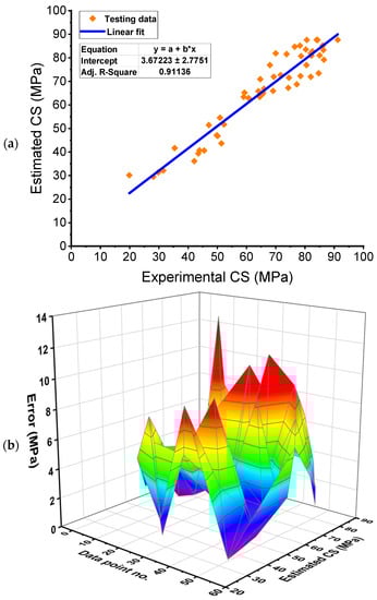 - Statistical and k-fold assessments were employed to confirm the employed model’s performance. Smaller errors and higher R2 reflect ML model accuracy. The mean absolute percentage error (MAPE) for the GB, RF, BR, and AR models was 11.2%, 7.40%, 7.30%, and 6.50%. These MAPEs further validated the best performance of the AR model, followed by BR, RF, and GB in predicting the CS of FRNSC.