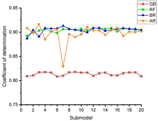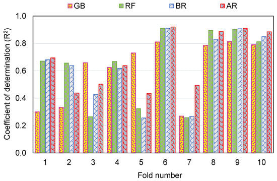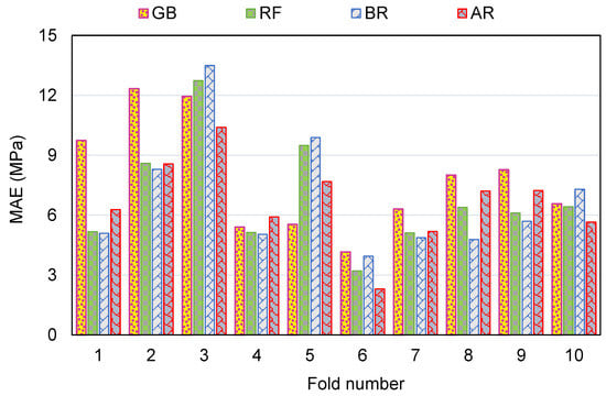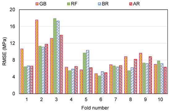 - K-fold analysis revealed that the average MAE for GB, RF, BR, and AR was 7.83, 6.84, 6.84, and 6.64 MPa, respectively. Similarly, the average RMSE for GB, RF, BR, and AR was 9.06, 8.23, 8.34, and 8.01, respectively. In contrast, the average R2 for GB, RF, BR, and AR was 0.61, 0.64, 0.64, and 0.68, respectively. The lower errors (MAE and RMSE) and higher R2 suggested the AR model had the highest precision among the others.