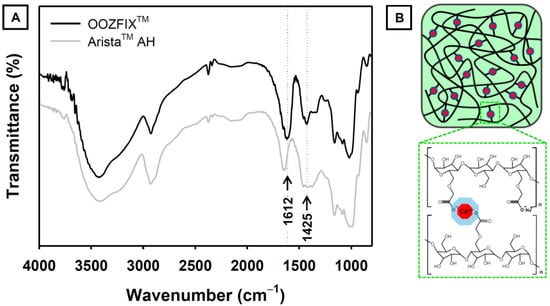 (A) Attenuated total reflection-Fourier transform infrared spectra of the OOZFIXTM and AristaTM AH hemostatic powders. The new peak in OOZFIXTM at 1612 cm−1 was attributed to stretching vibrations of the carboxymethyl group in the ionic assembly with calcium. (B) Schematic of ionic assembly between carboxymethyl starch branches and calcium ions.