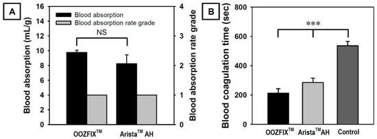 (A) In vitro blood absorption and blood absorption rate grade (n = 3) and (B) in vitro blood coagulation time (Lee–White method, n = 5) of the OOZFIXTM and AristaTM AH hemostatic powders. Grade 1: <5 s, Grade 2: 5–10 s, Grade 3: 10–30 s, Grade 4: >40 s (NS: not significant, *** p < 0.001).