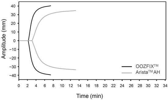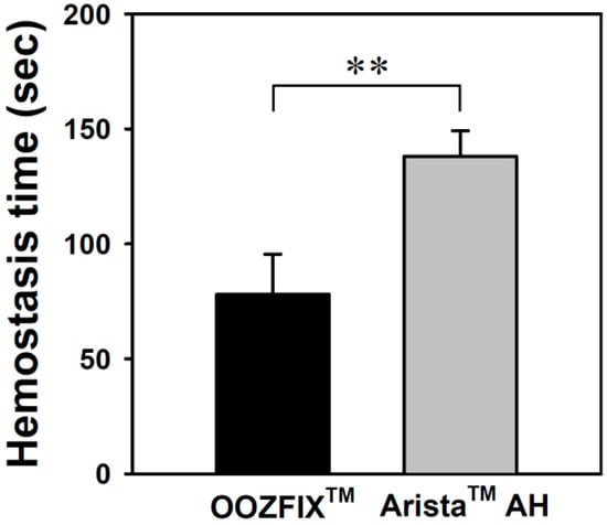 During in vitro evaluation, the amount and rate of blood absorption until maximum absorption are measured by contacting the blood with a hemostatic powder. As shown in Figure 3A, OOZFIXTM and AristaTM AH powders exhibit similar blood absorption amounts and both show a Grade 1 blood absorption rate (less than 5 s). The amount and rate of blood absorption are proportional to the source materials and specific surface area [3,4,5]. As shown in Figure 1, the powders have the same base material and similar particle sizes. Therefore, the amount and rate of blood absorption do not differ significantly.