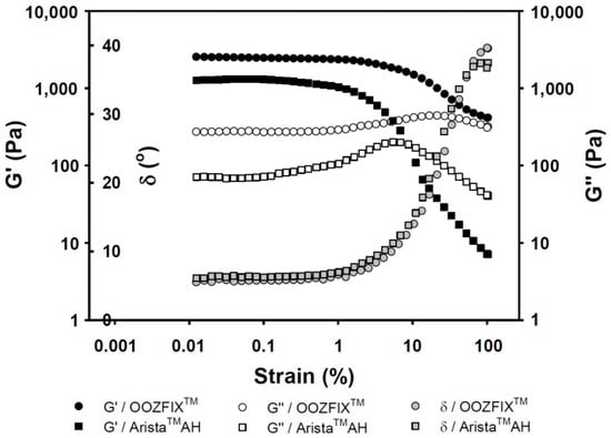Rheological gelation properties (G’: storage modulus, G″: loss modulus, and δ: damping, tangent 45° = 1) against strain for the hemostatic agents after water absorption (gel state containing 7.5% water).