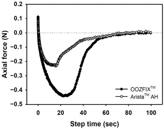 Bioabsorbable hemostatic powders have been widely adopted for the convenience of their use in narrow and complicated sites, particularly during laparoscopy. However, their efficacy is limited because of partial desorption at the bleeding site, which is not observed with other types (fabric, sponge, gel) of hemostatic agents [16,17]. A tissue-adhesive hemostatic powder would solve this issue and show fair hemostatic ability without serious loss of hemostatic powder. As shown in Figure 6, the adhesive strength of the OOZFIXTM group is −0.45 N, which is twice that of the AristaTM AH group. The OOZFIXTM powder is a carboxymethyl starch-calcium ion assembly [15], and its hydrophilicity increases with hydrogelation through blood plasma absorption, thus enabling strong adhesion of the OOZFIXTM gels.