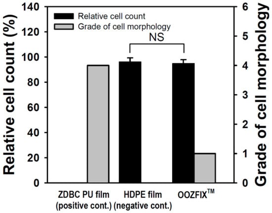 For qualitative evaluation, it was determined under ISO 10993-5 regulation. Eluate of the test substance had no cytotoxicity if it was grade 2 or less. Quantitative evaluation was carried out after qualitative evaluation, and Trypsin-EDTA was treated in each cell culture well and incubated for about 5 min in an incubator. Relative cell count (RCC) was calculated as the following equation.