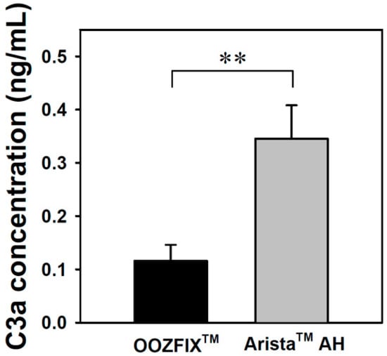 C3a complement system activation assay of the hemostatic powders in human blood (n = 3, ** p < 0.01).