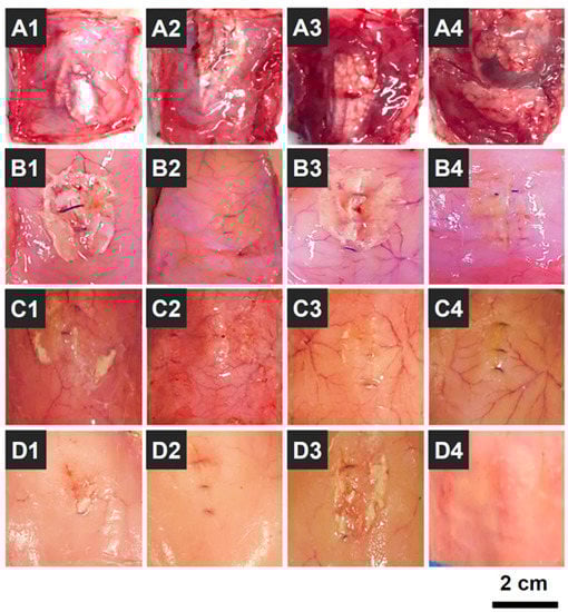 Photographs of in vivo biodegradation of the OOZFIXTM hemostatic powder (0.2 g) that was intradermally injected into the rat scapula (n = 16); (A1–A4) 1, (B1–B4) 2, (C1–C4) 3, and (D1–D4) 4 weeks after the injection.