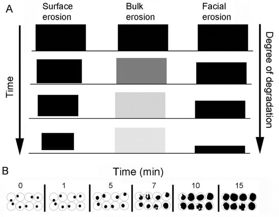 Schematic illustration of the different modes of mass loss from degradable polymers. (A) Conventional understanding of polymer degradation includes surface erosion and bulk erosion [16]. Facial erosion describes the degradation of polymers adherent to visceral organ surfaces. (B) Example of circular pectin films immersed in water. The pectin films demonstrate progressive swelling and dissolution.