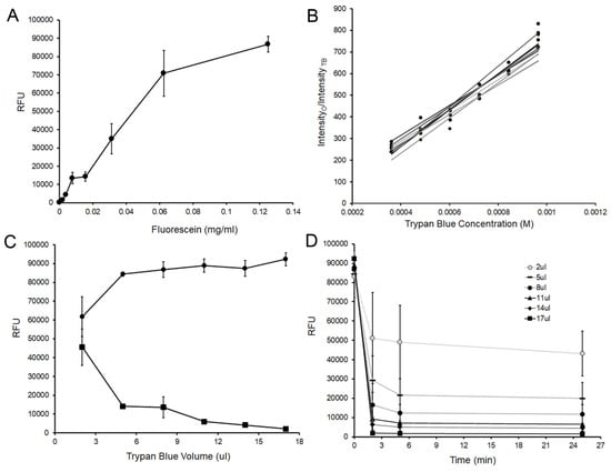 Characterizing the fluorescein fluorescence and trypan blue quenching. (A) The fluorescein standard curve was linear at lower concentrations. Modest nonlinearity at the higher concentrations was likely due to auto-quenching and detector saturation. (B) Trypan blue was used to quench the released fluorescein tracer. The effectiveness of trypan blue quenching was assessed over a 2-fold range of fluorescein concentrations from 1.95 ug/mL (light gray line) to 125 ug/mL (black line). At these fluorescein concentrations, the experimentally obtained Stern-Vollmer plot was linear with an aggregate constant of 7.15 × 105 M−1 (R2 = 0.9754). (C) Using standard 0.4% trypan blue solutions, the quenching of 125 ug/mL of fluorescein (circles) was assessed at increasing volumes of trypan blue (squares). Greater than 90% of the detectable fluorescence was reduced above 5 uL of trypan blue. (D) The trypan blue-associated quenching was rapid and stable. Maximal quenching occurred within seconds of the addition of the trypan blue at all volumes from 2 uL (light gray line) to 17 uL (black line). Error bars = 1 SD.