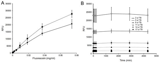 Fluorescein tracer embedded into the pectin films. (A) Pectin films embedded with fluorescein demonstrated a mostly linear relationship to fluorescein concentration (solid line). A slight increase in fluorescence was noted after pectin dissolution with distilled water (10 uL) (dotted line). (B) Tracer fluorescence, at a variety of concentrations, was stable for 72 h. Serial dilutions are shown from 37 ug/mL (black line) to 2.3 ug/mL (light gray line). Error bars = 1 SD.