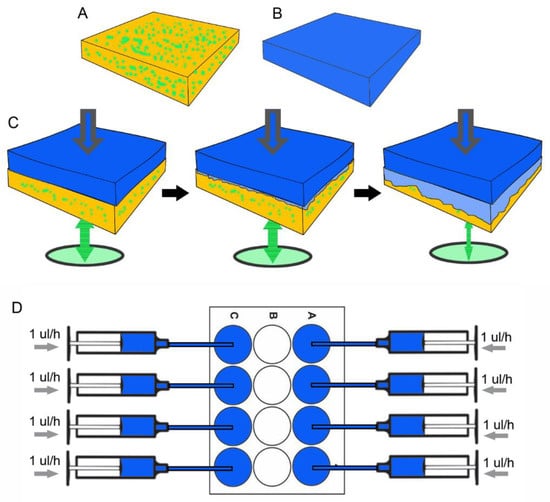Schematic of facial erosion assay. (A) Pectin with fluorescein tracer embedded in pectin free volume. (B) Trypan blue loaded into cellulose-based 6 um-pore filter matrix (12 mm diameter) providing the interface. (C) The contact of the trypan blue matrix and the fluorescein-labeled pectin results in gradual loss of fluorescein from the pectin matrix. Loss of the fluorescein is quantitatively assessed by the microfluorimeter from the bottom of the plate (green arrow). (D) A microfluidics syringe pump perfusion system allowed for the computer-controlled parallel perfusion of 8 samples. Most samples were perfused at 1 uL/h.
