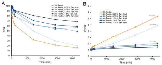 Dose-dependent effect of tannic acid on pectin film degradation over 3 days of continuous microperfusion. (A) Substantial pectin facial erosion occurs over the first day (orange). (B) Surface erosion demonstrated reproducible kinetics. Plots of 1/RFU demonstrated straight lines for all samples (R2 ranged from 0.9943 to 0.9332). Facial erosion half-life for pectin alone was estimated at 14 h. The estimated half-life of pectin increased with increasing tannic acid concentration: 0.25%, 20 h; 0.75%, 69 h; 1.25%, 79 h; 1.5%, 99 h; and 1.75%, 154 h.