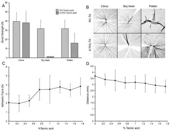 The effect of tannic acid on the physical properties varied with the source of pectin. Citrus high-methoxyl pectin, the pectin source used in the previous experiments, demonstrated no significant change in pectin film burst strength. In contrast, tannic acid weakened the burst strength of pectins derived from soy bean and potato sources (Figure 7A). Consistent with the burst strength findings, the fracture patterns of citrus pectin were similar with and without tannic acid. Soy bean and potato films demonstrated significant changes in fracture patterns with the addition of tannic acid (Figure 7B). Finally, tannic acid did not diminish pectin-pectin adhesivity (Figure 7C) nor did it significantly impact citrus pectin extensibility (Figure 7D).