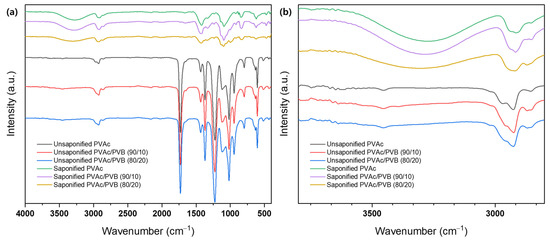 The conversion of PVAc/PVB to PVA/P(VB–VA) caused the observed changes in vibration bands. Minor changes in peak position and intensity at 500–2000 cm−1 are also attributed to the formation of a PVA/P(VB–VA) film from a PVAc/PVB film. Figure 3b shows that as the PVB content in the PVAc/PVB blend film increased (PVAc/PVB 80/20), the O–H peak intensity decreased. The reason for this could be that both PVAc and PVB saponification were affected by steric hindrance at higher PVB contents because of the crosslinked network structure of PVB. Similar phenomena regarding the O–H peak intensity were reported in P(MMA–MAA) blend films [33].