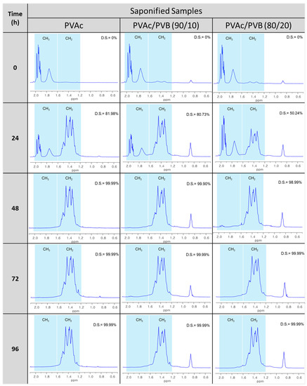 1H-NMR spectra of saponified PVAc, PVAc/PVB 90/10, and PVAc/PVB 80/20 films at a saponification temperature of 50 °C and various saponification times (0–96 h).