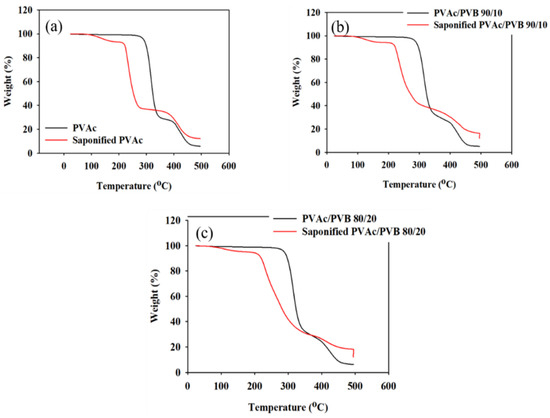 The effect of saponification on the thermal stability of the pure PVAc film and PVAc/PVB blend films with different ratios were examined by TGA and derivative thermogravimetry (DTG), and the results are shown in Figure 6 and Figure 7, respectively. The obtained degradation temperatures are listed in Table 3. As shown in Figure 6a, the saponified PVAc film showed higher thermal stability than the unsaponified PVAc film above the degradation temperature of 330.5 °C. The blend films exhibited similar behavior (Figure 6b,c).