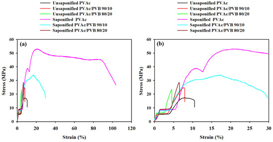 The stress–strain curve of the saponified pure PVAc film shows strain hardening and necking. Strain hardening indicates increased resistance to distortion after extension and the alignment of polymer chains in the saponified PVAc film; it is also affected by the presence of PVB in the saponified PVAc/PVB blend films. The same behavior was also observed in a PVA–polyethylene glycol–Ag2S hybrid polymer film [56].