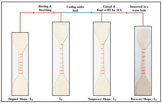 Shape memory tests were performed using a universal testing machine (UTM) (Instron 5569 Model, Norwood, MA, USA) equipped with a heating chamber. The following steps were performed: (1) The specimen with an initial length of L0 was heated to a constant programming temperature (Tp) and maintained at that temperature for 5 min. It was then stretched to a specified% strain at a constant strain rate of 10 mm/min. (L1). This constraint was maintained while the specimen was quenched with an ice pack. (3) After removing the specimen from the test equipment, it was kept at room temperature for 24 h (L2). (4) The stretched specimens were immersed in a water bath at a specific recovery temperature (Tr) to observe the recoverability of the specimen (L3). The test specimen collected at each stage of the shape memory test is illustrated in Figure 1. Tests were done on at least five specimens from each experimental condition. Shape recovery ratio (Rr) and shape fixity ratio (Rf) values of the specimens were determined as follows [39]: