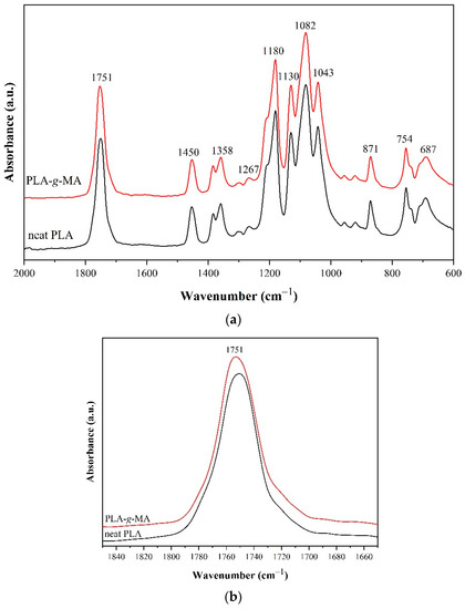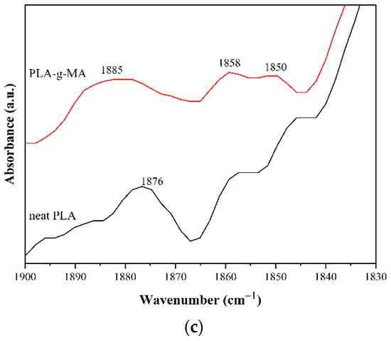 FTIR spectra of neat PLA and PLA-g-MA. (a) wavenumber range 2000–600 cm−1 (b) wavenumber range 1840–1660 cm−1 (c) wavenumber range 1900–1830 cm−1.