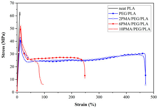 Stress-strain curves of PLA and PEG/PLA blends with various PLA-g-MA contents.