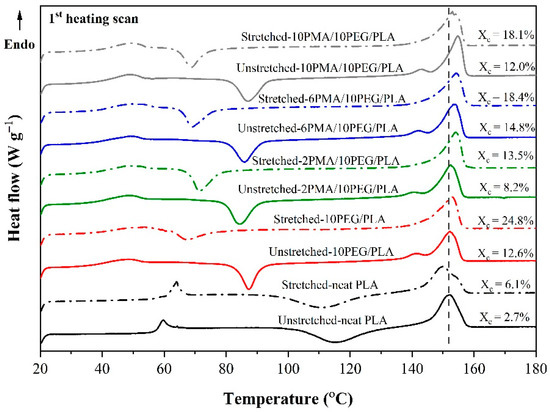 DSC thermograms of PLA and PEG/PLA blends in their unstretched and stretched states. Vertical line is used as a visual guideline for the shift of melting peak of the samples.