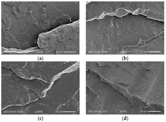 The addition of PLA-g-MA increased Young’s modulus and tensile strength of the compatibilized PEG/PLA blends, and the values increased with increasing PLA-g-MA content. The change in elongation at break of the 2PMA/PEG/PLA was statistically insignificant as compared to that of the uncompatibilized PEG/PLA. The results suggested that the existence of 2 wt% PLA-g-MA increased the compatibility of the PLA and PEG phases. The enhanced compatibility steamed from the grafting reaction between the anhydride groups of MA and hydroxyl groups of PLA similar to that reported by Hassouna et al. [36]. This interaction enhanced the interfacial adhesion by improving stress transfer around the interface, resulting in an increase in tensile strength while elongation at break remain unchanged. As PLA-g-MA concentrations increased up to 10 wt%, the elongation at break of the 6PMA/PEG/PLA and 10PMA/PEG/PLA significantly dropped. The plausible explanation was that an excess of PLA-g-MA was oversaturated at the interface. PLA-g-MA coalescence may form, consequently causing the decline of interfacial tension between the polymer components in the blend [40,41]. Similar findings were reported by Tang et al. [40] in the system of ethylene terpolymer as a compatibilizer of poly(ethylene terephthalate) (PET) and high-density polyethylene (HDPE) blends, and Liu et al. [41] in the system of maleated thermoplastic elastomer as a compatibilizer of polypropylene (PP)/polyamide-6 (PA6) blends.
