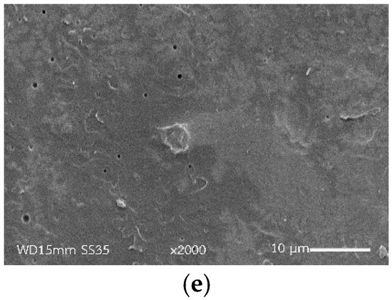 SEM micrographs of cryogenically fracture surfaces of (a) neat PLA, (b) PEG/PLA, (c) 2PMA/PEG/PLA, (d) 6PMA/PEG/PLA and (e) 10PMA/PEG/PLA.