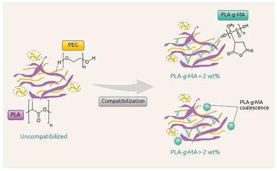 Schematic diagram for interaction between PLA, PEG, and PLA-g-MA.