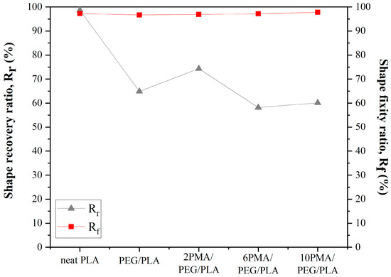 Shape recovery (Rr) and fixity (Rf) ratios of neat PLA and PEG/PLA blends with various PLA-g-MA contents are shown in Figure 7. In this experiment, the programming and recovery temperatures were 45 and 60 °C, respectively, since these temperatures were slightly higher than Tg of the PEG/PLA blends.