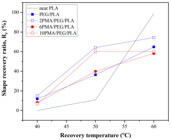 Additionally, the effect of recovery temperature (Tr) on shape recoverability of PLA and PEG/PLA blends was examined. The stretched specimens were subjected to different temperatures of the water bath at 40, 50, and 60 °C to measure the recoverability. Their Rr values are illustrated in Figure 8.