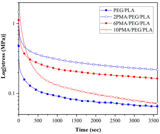 According to Tcharkhtchi et al. [44], the residual stress can be considered as the driving force for a SMP to regain its original shape. Shape recovery performance of the PEG/PLA blends can be explained by observing their stress relaxation behaviors at the shape programming temperature of 45 °C. The experiment was designed in a manner similar to the shape programming procedure; the specimen was first heated to 45 °C for 5 min before being stretched to 100% strain and monitored the stress reduction for 1 h. The stress relaxation curves of these specimens are illustrated in Figure 9.