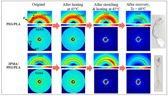In the initial state, both uncompatibilized PEG/PLA and 2PMA/PEG/PLA exhibited unclear SAXS scattering patterns, indicating the random conformation of the polymer chains. The 2D-WAXS pattern of the uncompatibilized PEG/PLA demonstrated the uniform intensity of both the amorphous halo (orange color area) and the single ring of crystalline at (200/110) plane around the azimuth angle. The 2D-WAXS pattern of 2PMA/PEG/PLA demonstrated the isotropy of two distinct rings corresponding to (200/110) and (203) planes of α-form PLA crystallites [27]. These suggested that the polymer chains were isotopically oriented in the initial state. In addition, their WAXS and SAXS scattering patterns remained unchanged after heating these specimens at 45 °C.