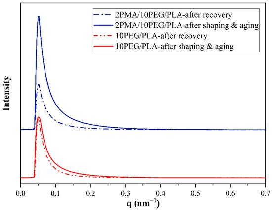 1D-SAXS plots along the equatorial axis of PEG/PLA and 2PMA/PEG/PLA specimens after aging and recovery at 60 °C.