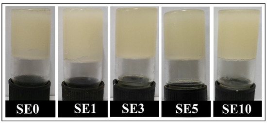 The %SR can be defined as the ability to absorb energy during strained conditions. The percentage of stress relaxation is calculated using Equation (4). The %SR of SE0 was similarly valued to the rest of the SYL-added samples (p > 0.05). SE1, SE3, and SE10 samples showed similar %SR values. The %SR value of SE5 was similarly valued to SE1 and SE3 (p > 0.05); however, the same was significantly lower than SE10 (p < 0.05). In summary, the addition of SYL in the RSO-SW oleogels did not greatly affect the viscoelastic characteristics of the oleogels. In addition, since the %SR values of all the oleogels were higher than 70%, the oleogels were predominantly elastic.