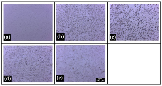 Bright-field micrographs: (a) SE0, (b) SE1, (c) SE3, (d) SE5, and (e) SE10.