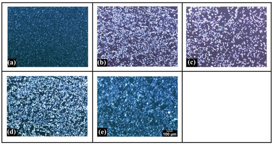 Polarized light micrographs: (a) SE0, (b) SE1, (c) SE3, (d) SE5, and (e) SE10.