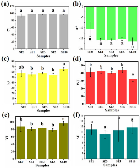 Lastly, the absolute color difference (ΔE) value was calculated using Equation (3). The ΔE value is always calculated concerning a particular standard, and the color difference information is represented as numerical values (Figure 4f). In our case, we have considered SE0 as the standard. The ΔE values were found to be in the range of 4 and 12, suggesting that the color difference among the samples can be identified by the naked eye [50]. However, ΔE values of the SYL-added samples were similarly valued (p > 0.05).