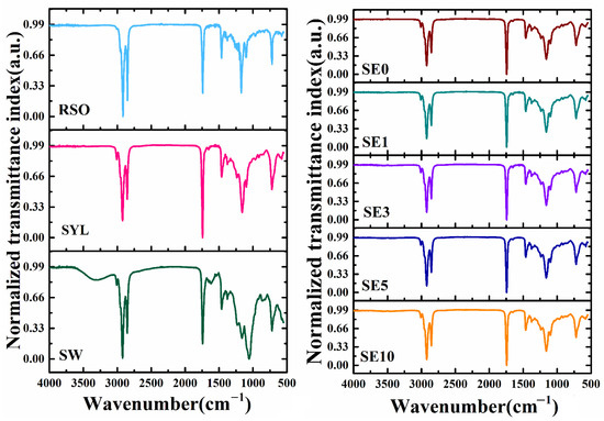 Further, the SW spectrum was similar to that of RSO and SYL, except for a few extra peaks in SW. The presence of a broad peak at 3312 cm−1 can be ascribed to the O–H stretching vibrations. SW and other vegetable waxes are comprised of long-chain fatty acids and saturated hydrocarbons [60]. Natural waxes consist of sterols, sterol esters, and long-chain alcohols, which give rise to hydroxyl group stretching vibrations [61].