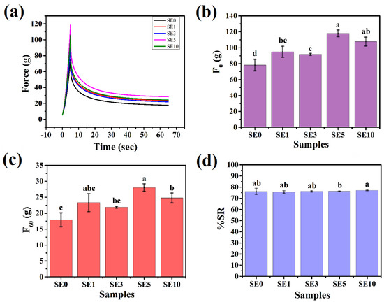 Mechanical parameters: (a) Stress relaxation profile, (b) F0 values, (c) F60 values, and (d) %SR values. The values denoted in the graph are the average ± SD of triplicate samples (Significance level, p = 0.05). Bars with different letters differ significantly (p < 0.05).