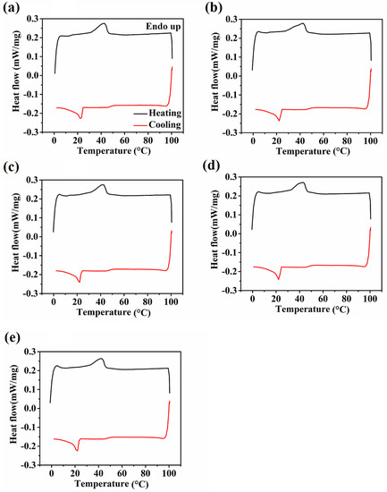 Thermograms of oleogel samples: (a) SE0, (b) SE1, (c) SE3, (d) SE5, and (e) SE10.
