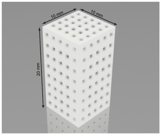 Universal testing machine equipped with 1 and 20 kN sensors (Zwick/Roell Z020, Zwick GmbH & Co. KG, Germany) was used to analyze the mechanical stability of the scaffolds. Additionally, to determine areas with maximum stresses (von Mises stress), equivalent strains, and possible mechanisms of destruction of the scaffold, a series of simulations of quasi-static uniaxial compression tests was carried out. The simulations of mechanical tests were performed using the Autodesk Fusion 360 2021 software with support for the study type Nonlinear Static Stress. The compressive strength and Young’s modulus (according to ASTM D695) of the scaffolds were determined by static compression tests. Rectangular scaffolds with dimensions of 10 mm × 10 mm × 20 mm (Figure S1) were prepared for this study.