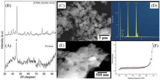 XRD patterns of combusted precursor (A) and wollastonite calcined at 800 °C for 2 h (B). SEM image (C); EDX spectrum (D) and HAADF-STEM (E) image of pure wollastonite. Nitrogen adsorption–desorption isotherm of pure wollastonite (F).