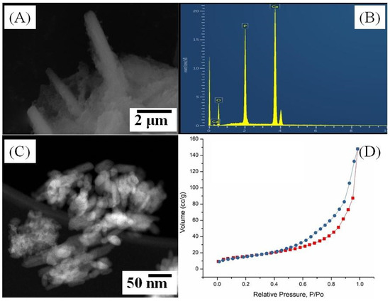 SEM micrograph (A), EDX spectrum (B), HAADF-STEM (C) image and nitrogen adsorption–desorption isotherm of commercially purchased HAp (D).