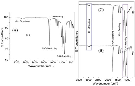 FT-IR spectra of PLA are shown in Figure 4A. The band at 2998 cm−1 was related to asymmetric stretching of -CH3, whereas symmetric stretching vibration at 2952 cm−1 corresponds to the -CH3 group. C=O stretching band was noticed at 1756 cm−1. The band at 1456 cm−1 was due to asymmetric bending of -CH3, while symmetric bending vibration at 1359 cm−1 was associated with -CH3. Intense peaks ranging from 1045 cm−1 to 1182 cm−1 correspond to the C-O stretching vibration of esters, whereas the vibrations from 736 cm−1 to 871 cm−1 correspond to C-COO bands. This shows the crystalline nature of PLA. This observation was found to be similar to earlier reports [50].