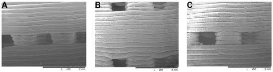 Structure of 3D printed PLA-based scaffolds: PLA (A); PLA/HAp (B); PLA/Wol (C), magnification ×50.
