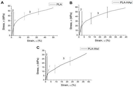 “Stress–strain” curve for PLA (A), PLA/HAp (B), PLA/Wol (C) scaffolds.